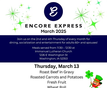 Enjoy a meal, socialization and entertainment at Encore Express during November! Enjoy a meal, socialization and entertainment at Encore Express during November! Monday, November 10, 2025 0 47 Enjoy a meal, socialization and entertainment at Encore Express during November! ***Please note: there will only be one meal this month! HACAP will be there providing produce as well!*** Adults... Read more