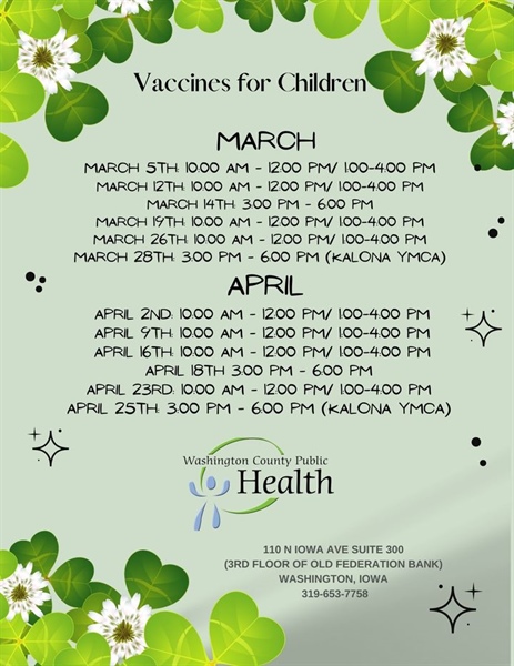 Emily Tokheim / Friday, March 1, 2024 / Categories: Social Media Posts Call us to schedule your child's next immunization appointment. Clinic dates for March and April below. Call us to schedule your child's next immunization appointment. Clinic dates for March and April below. Print 425